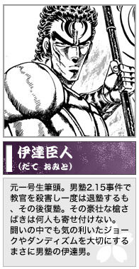 背後に3人のモブキャラを従えた伊達が眼前に立つ(つまりあのコマの中にはいない)三面拳に